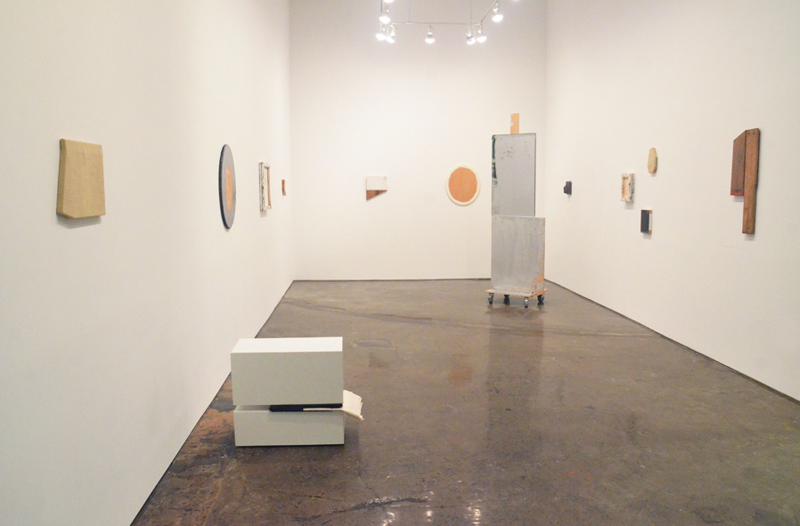 John Beech’s works merge the formal concerns of Minimalism with the common materials and utilitarian objects found in the everyday urban environment, including “discovered” materials, cast offs, garbage bins, and moving dollies. In her work, Sharon Brant applies dense, opaque encaustic paint in black or white around the outer perimeter of beveled oval panels leaving irregular, suggestive patches of wood grain suspended at their centers. Vincent Como’s ongoing work foregrounds a semiotic approach to the color black, and through a wide array of diverse materials, investigates the myriad associations of black as an observable pigment and an absorber of light. Black acts as both a mark of information and an agent of its negation. Working with the properties of matter, color, and irregularity, Michelle Magot’s employs absurd and illogical strategies to investigate the creative act, the unconscious, and non-referential spaces. And finally, Lael Marshall fashions irregularly shaped remnants of wood covered in repurposed fabric, paint, and on occasion cat hair, into humble, diminutive objects that evoke a raw sublime.
